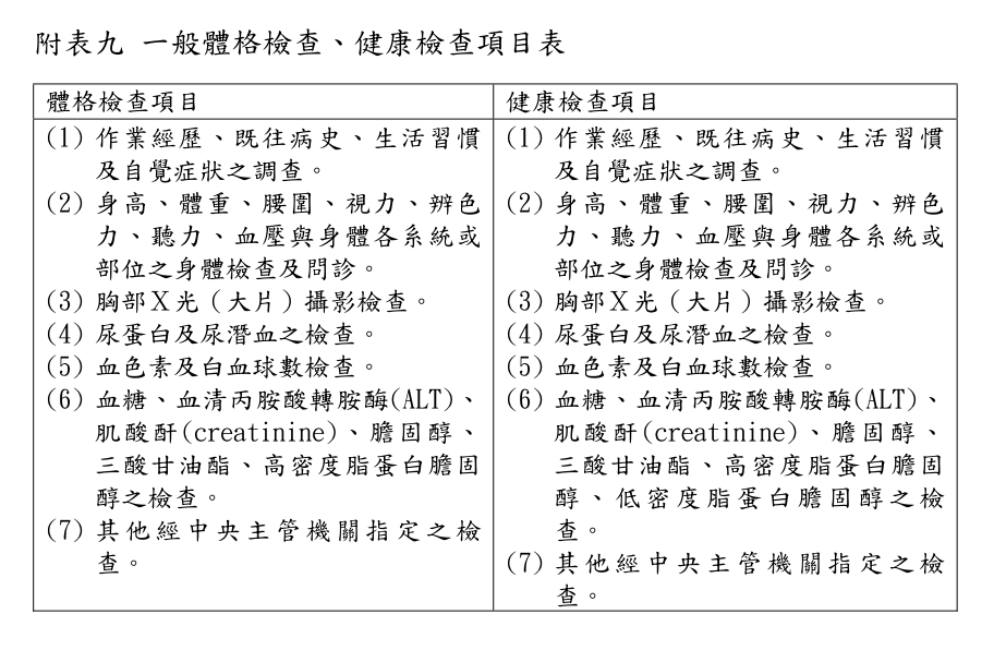 其實,兩者在法定的基本檢查項目上是幾乎相同的(皆包含身高體重、視力、聽力、血壓、胸部X光、基本血液與尿液常規檢查等)。它們最大的差異在於實施的目的: